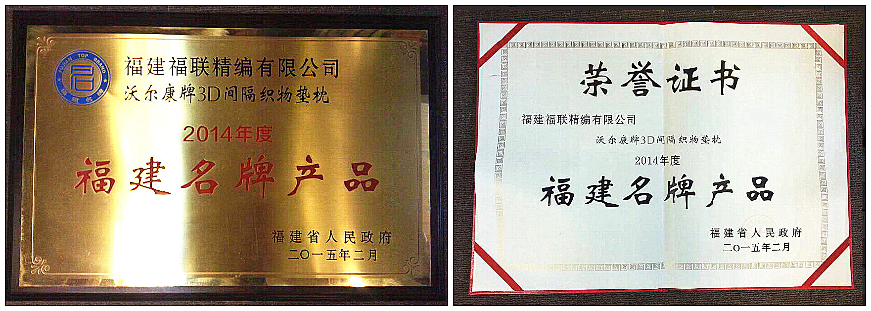 省政府授予“沃尔康牌3D间隔织物垫枕”福建名牌产品称号