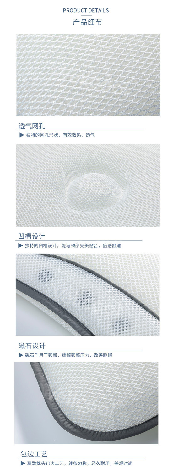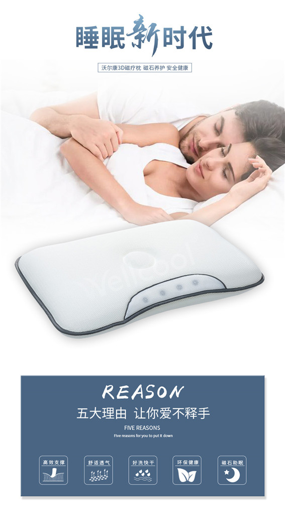 沃尔康3D磁疗枕采用3D材料填充和磁石结合, 既可以透气可水洗,保持枕头的干净整洁又可以助眠,一举两得。