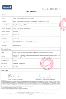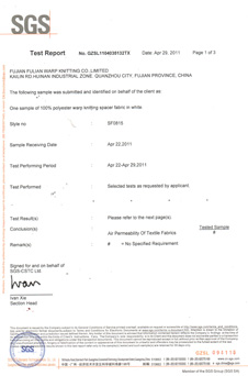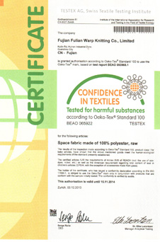 公司首家建立中国3D织物检测标准Q/FLJB001-20007、产品获得了OeKe-TEX、SGS、Intertek、3C等系列认证。设立国内先进的检测室,拥有各种检测设备,完成从原料到成品的强度、耐疲劳度、环保程度等多项指标的品质监测和管理。